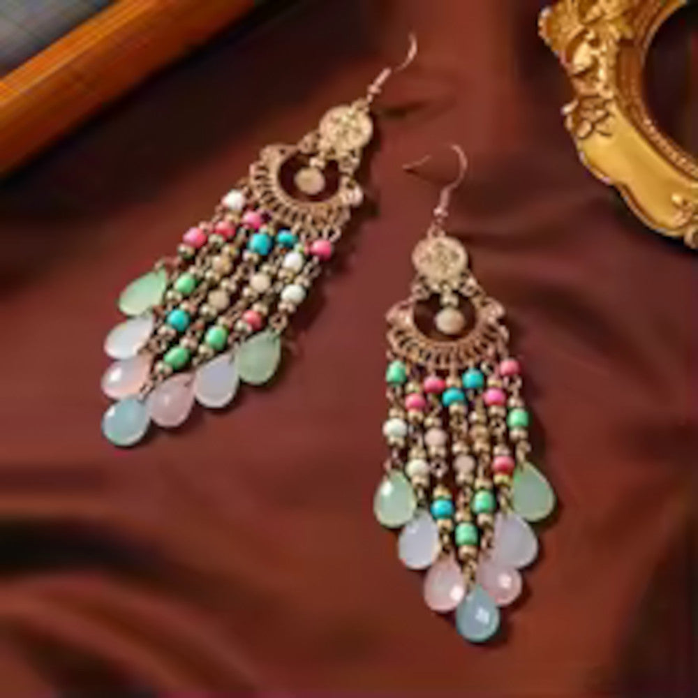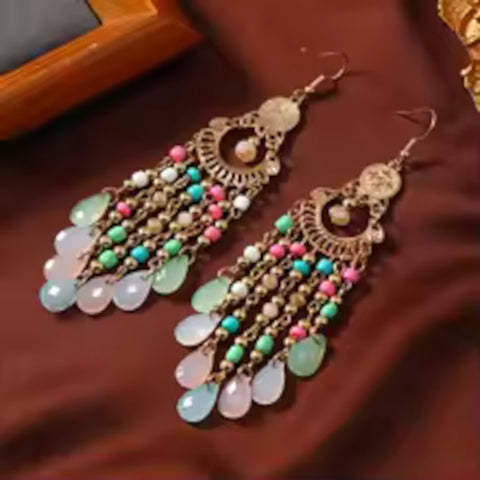The intricate design is anchored by an antiqued gold-tone filigree top, giving them a rich, Bohemian and Chandelier silhouette. They are the perfect statement piece to elevate any outfit, from summer dresses to evening wear. Lightweight enough for comfortable, all-day wear, these are an absolute must-have for lovers of Boho Chic jewelry.