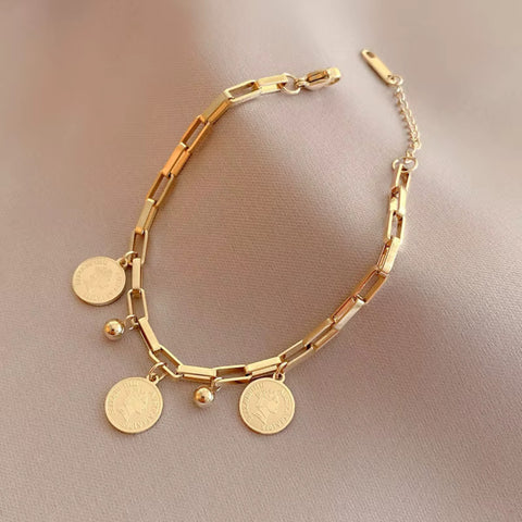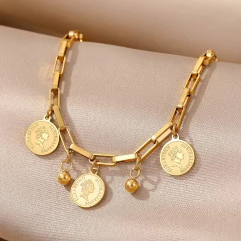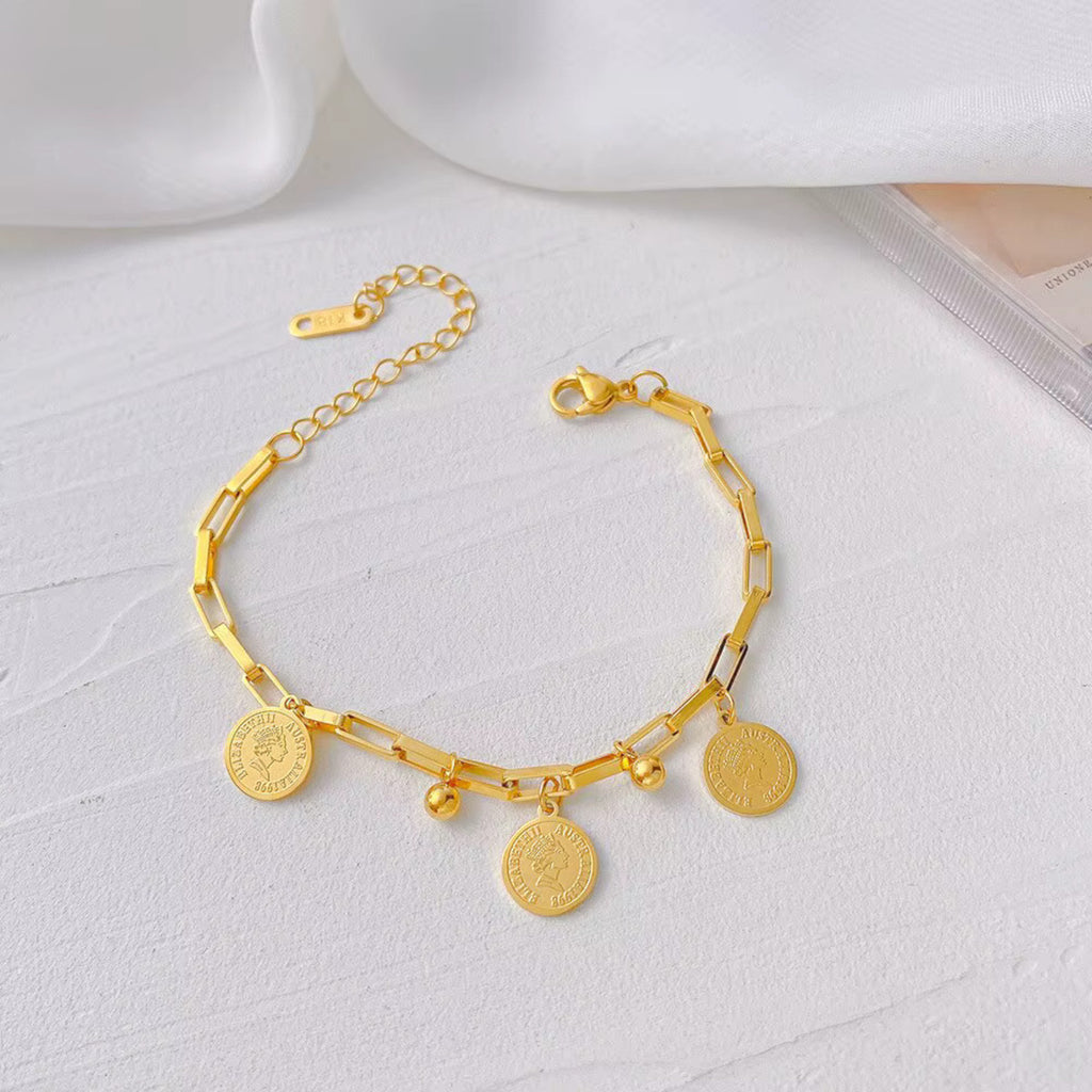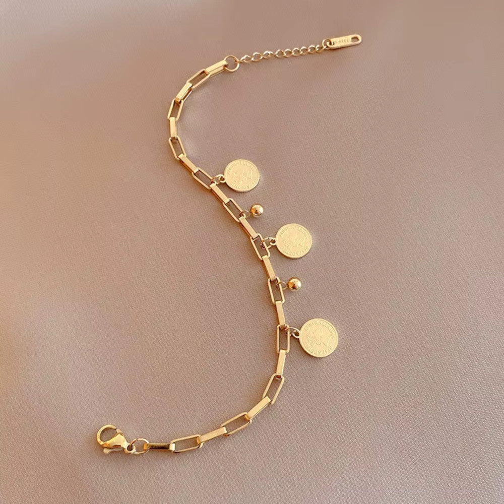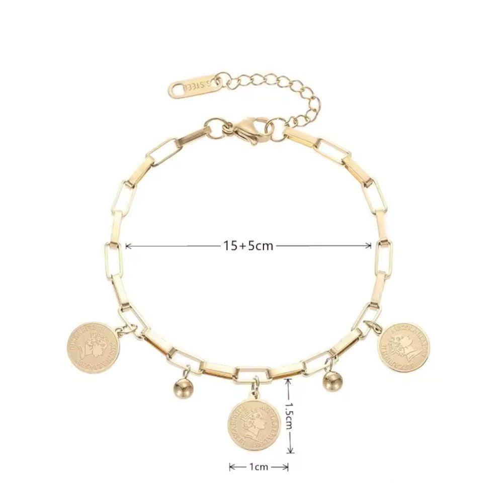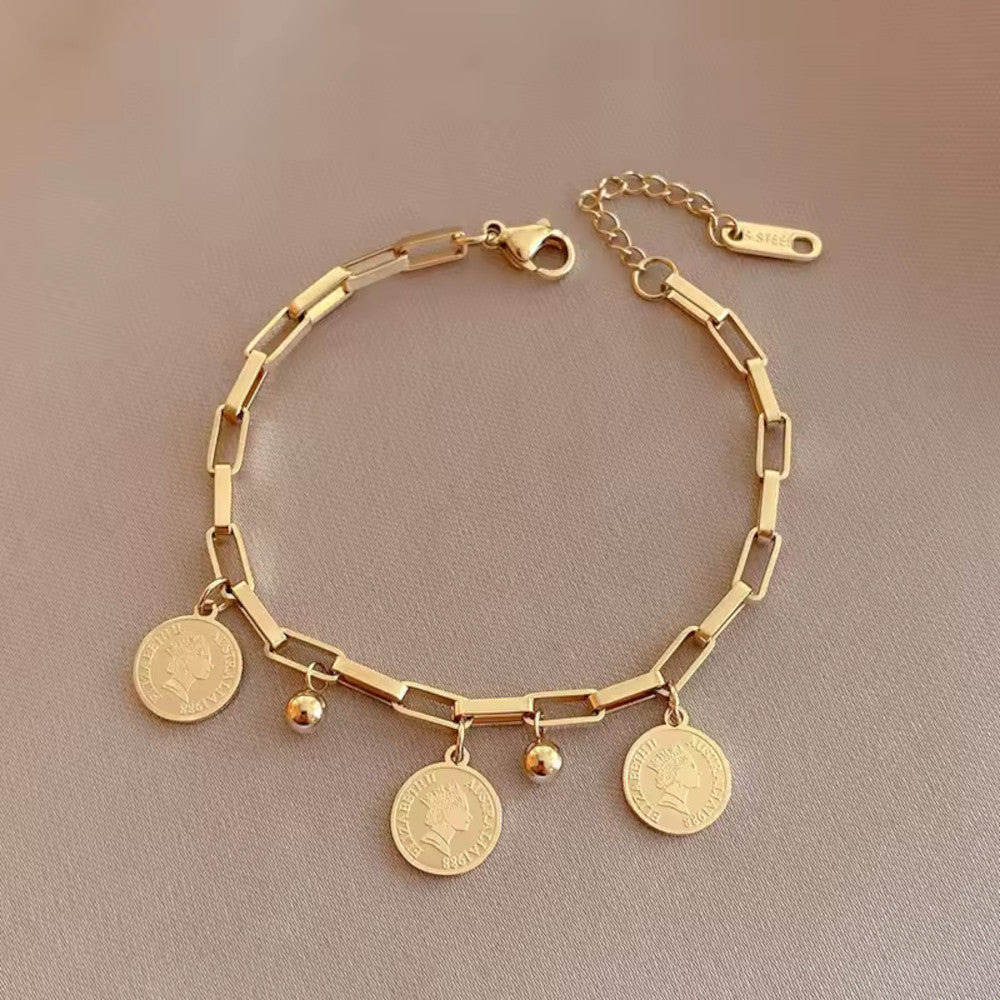 Capture a piece of classic style with this beautiful Gold-Tone Rectangle Link Chain Charm Bracelet. The bracelet utilizes a chic, elongated rectangular link chain that provides a contemporary texture and feel. Dangling gracefully from the chain are three distinctive coin medallions, each stamped with a portrait resembling Queen Elizabeth (or other classic profile). These medallions are interspersed with small, polished gold ball charms. The bracelet is secured with an adjustable length and a lobster clasp. This fashionable piece is perfect for layering with watches or other bangles, or wearing solo for a minimalist-luxe look.