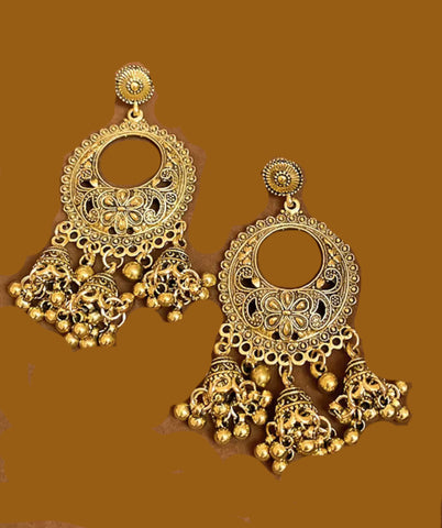 Representing a classic fusion of exquisite craftsmanship and feminine elegance, these gold tone jhumka earrings will definitely be a treasured inclusion in every woman's jewelry collection.